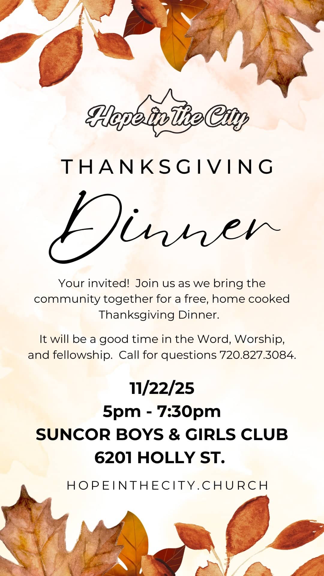 Suncor Boys & Girls Club 6201 Holly StHope in the City is hosting a community Thanksgiving Dinner on Saturday, November 22, 2025, from 5:00 PM to 7:30 PM at the Suncor Boys & Girls Club (6201 Holly St.).The event is a free, home-cooked Thanksgiving meal designed to bring the community together for an evening of food, fellowship, worship, and the Word. It’s an open invitation for anyone who would…